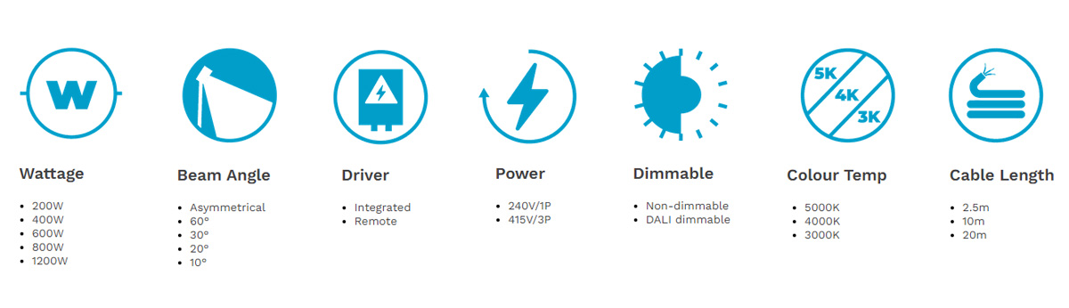 Other options for customisation are shown below. This includes power (240V or 415V), choosing a dimmable or non-dimmable driver, specifying your colour temperature (5000K standard) and finally choosing your power cable length.