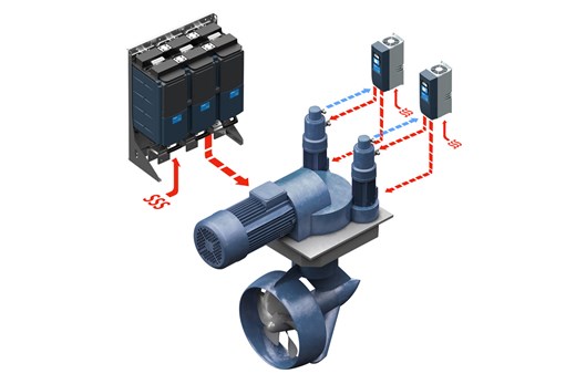 Electrically-steered azimuth thrusters deliver more accurate control and respond more quickly than a hydraulic steering system. A minimum of two parallel motors and drives are always in use. If one combination stops, the steering system continues to operate.