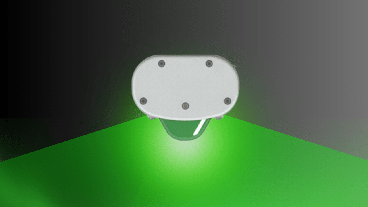 The V-shaped optic spreads the green light outward in a controlled and intentional pattern. This broad beam creates a more noticeable and consistent illuminated zone around the safety shower. Workers are able to identify the green signal sooner and from more approach angles, even when equipment or structures partially obstruct their view.